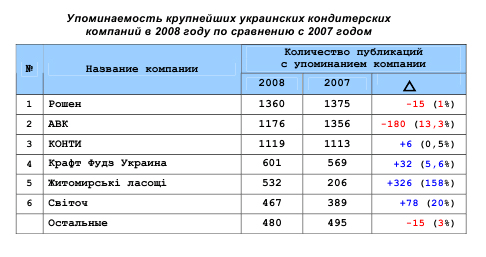 Согласно результатам анализа, упоминаемость большинства из анализируемых кондитерских компаний по сравнению с 2007 годом увеличилась. Абсолютная положительная динамика медиа-присутствия оказалась наилучшей у компании "Житомирські ласощі". Значительный рост медиа-активности этой компании (количество публикаций с упоминанием компании увеличилось более чем в 2,5 раза) свидетельствует об изменении медиа-стратегии житомирского производителя сладостей.